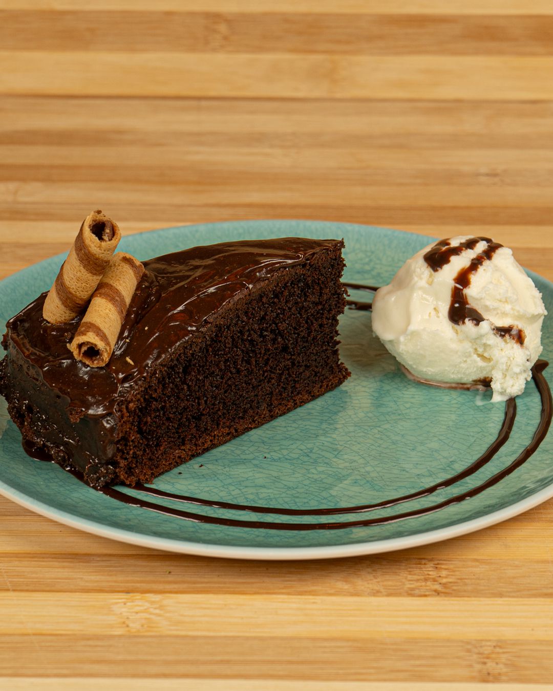 disfruta de la suavidad y la cremosidad de nuestra torta de Chocolate, un sabor dulce y amargo porque contiene cacao al 100 y al 80%, acompañada de un helado de vainilla